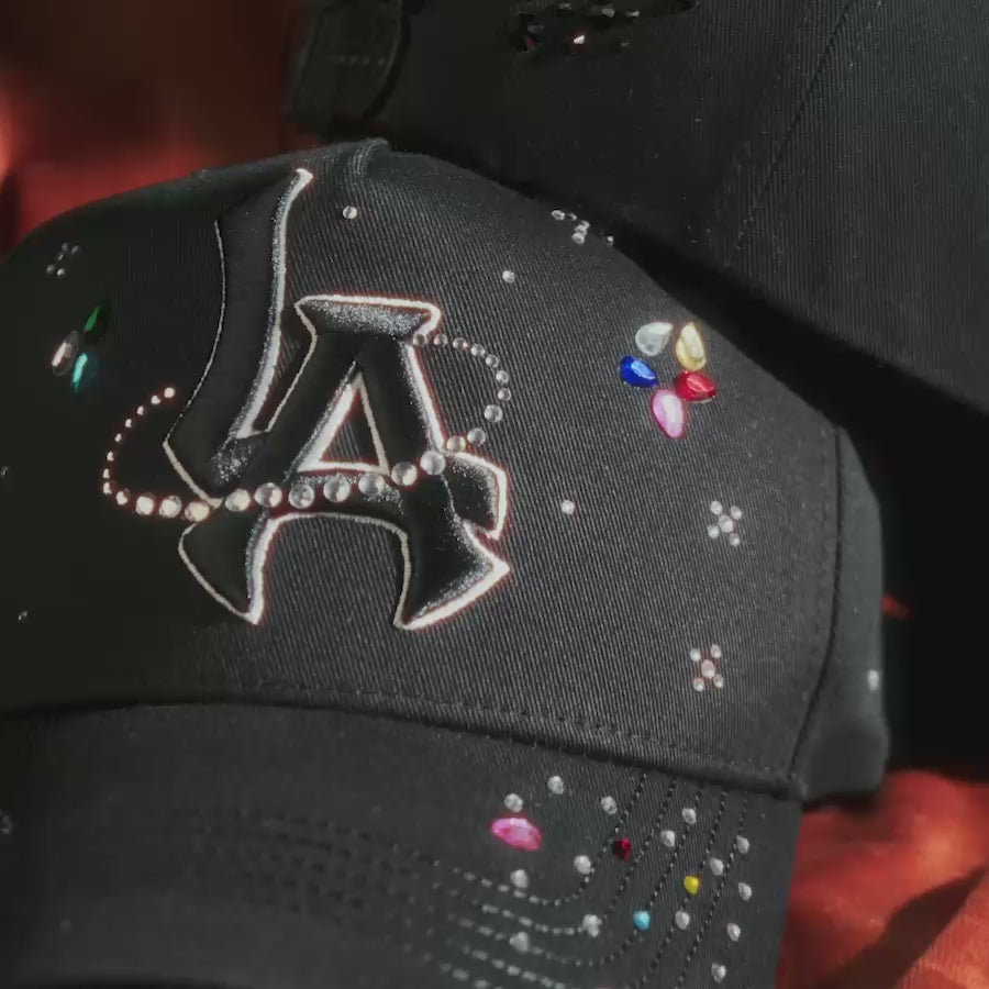Gorra El Mago edición total black con pedrería y bordados exclusivos. Diseño premium de 31 hats que combina elegancia urbana con detalles artesanales. Pieza imprescindible para tu colección streetwear.