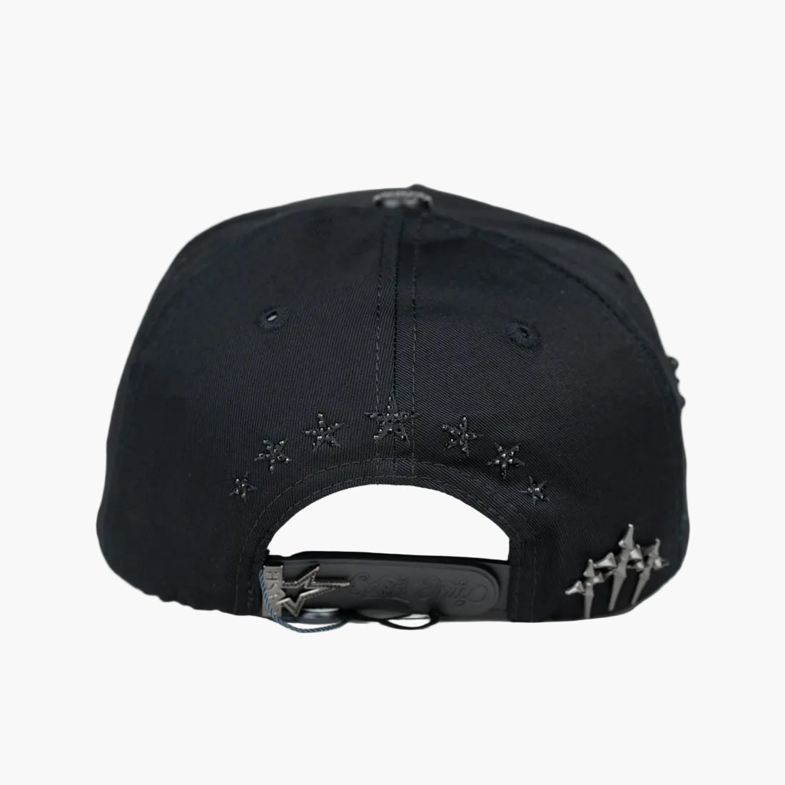 Gorra Cash Only con logo LA y pedrería negra. Diseño elegante y sofisticado, detalles brillantes que capturan luz. Complemento perfecto para looks de lujo urbano.
