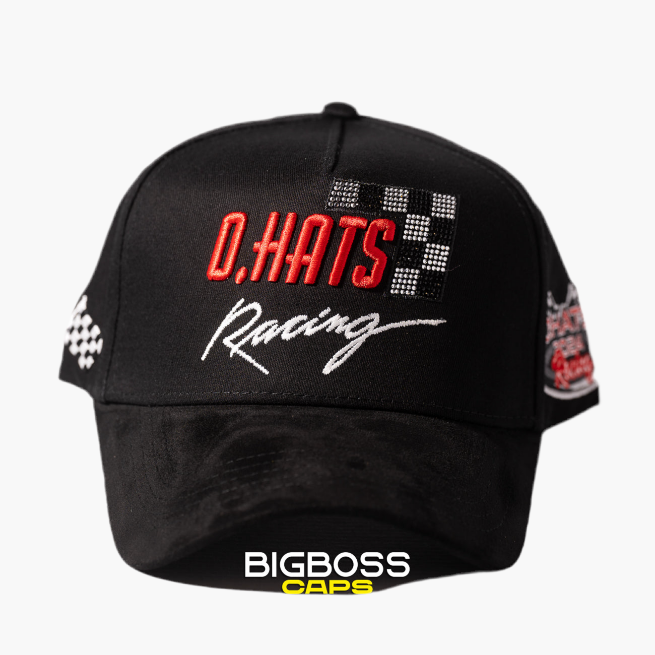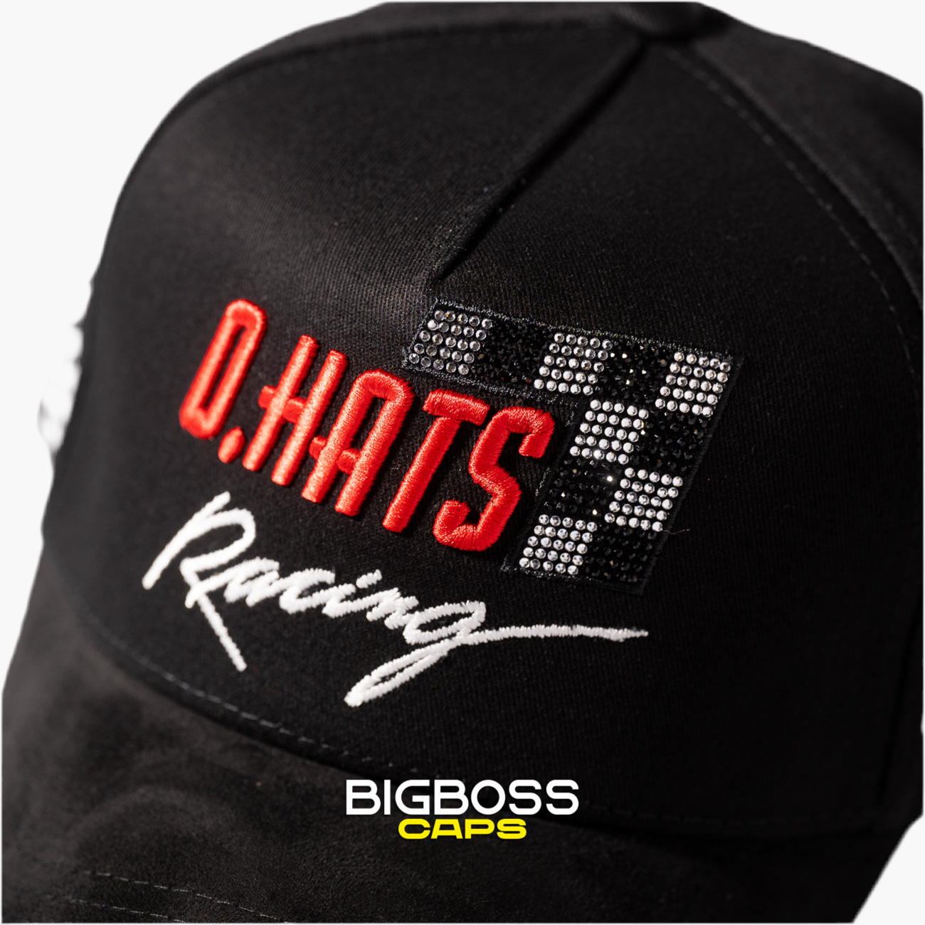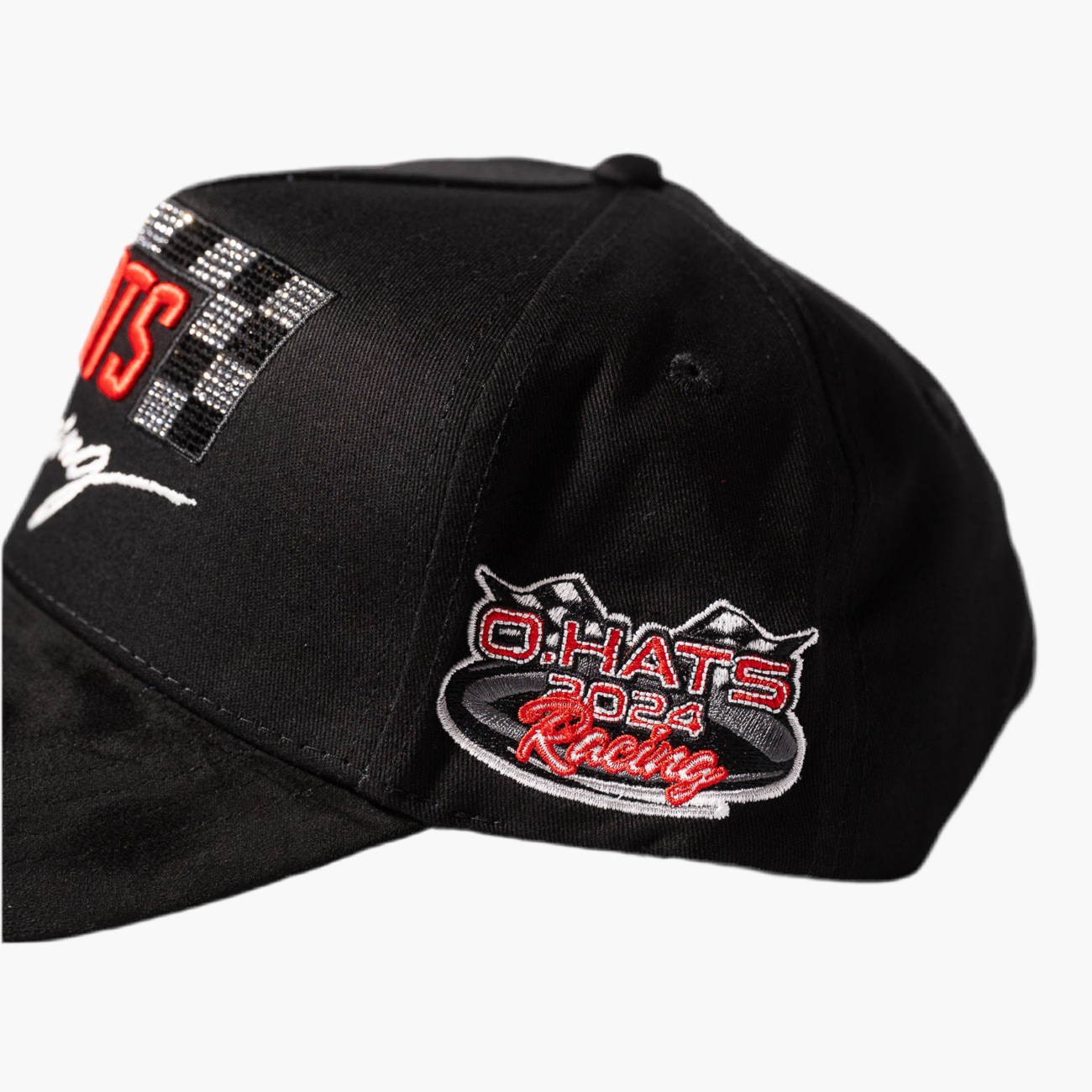 Esta gorra negra presenta en la parte frontal el texto bordado "O.HATS" en color negro, complementado con la palabra "racing" en cursiva y color blanco justo debajo. Su diseño sencillo y elegante la hace ideal para quienes buscan un estilo deportivo y moderno en su día a día.