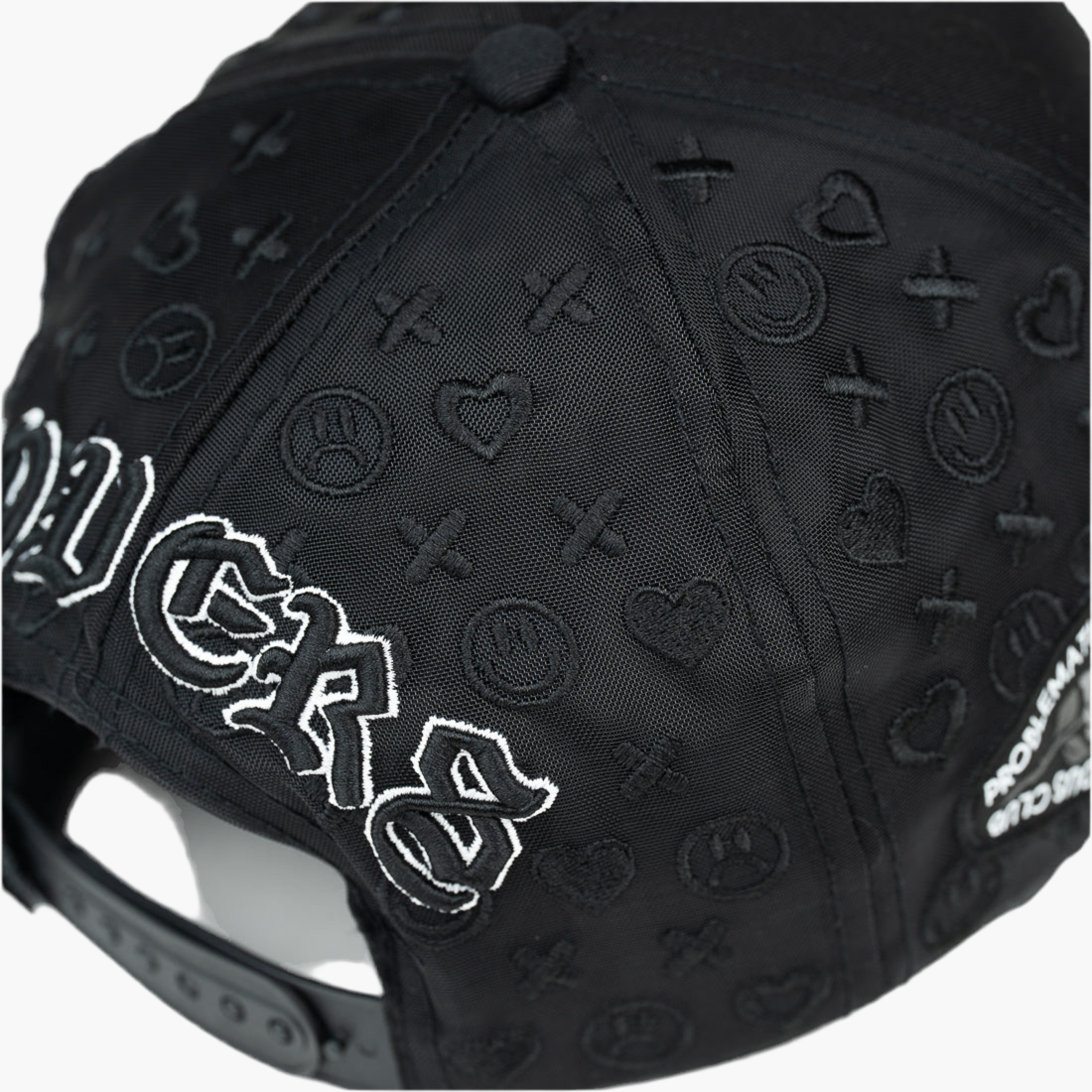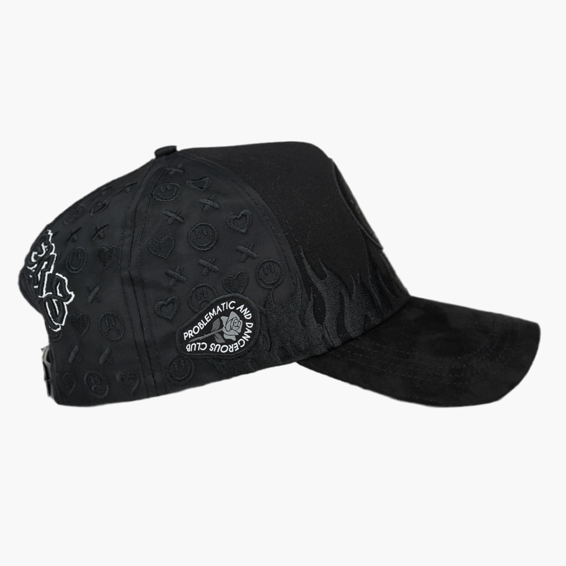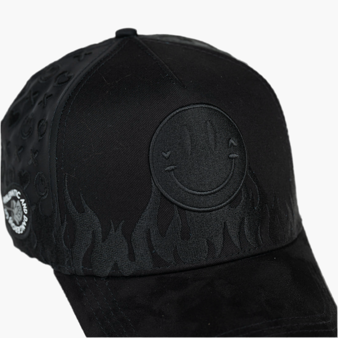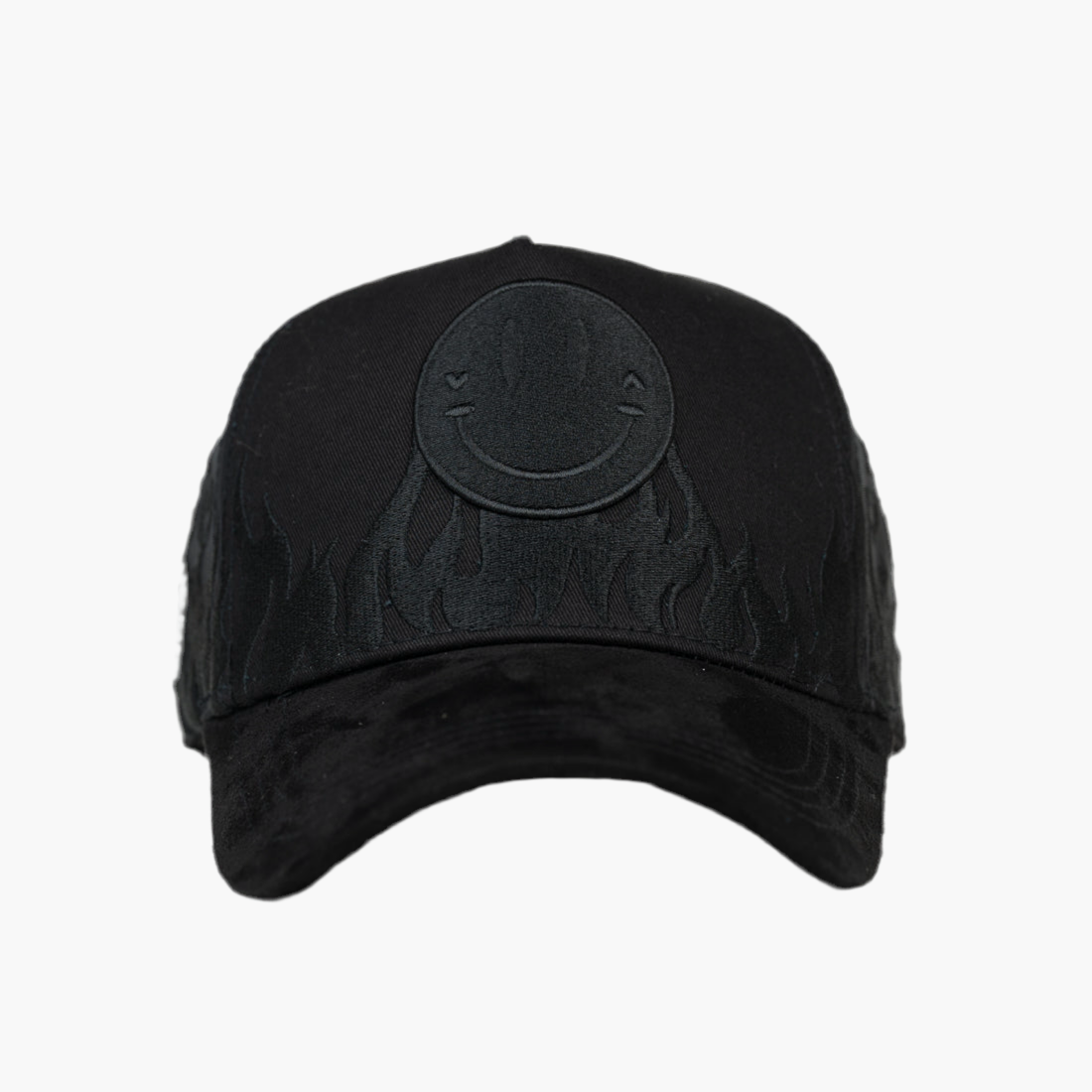 Gorra negra con un diseño llamativo: en la parte frontal está bordada una cara feliz, y justo debajo, unas llamas negras que añaden un toque audaz y moderno. Esta combinación aporta estilo y personalidad, perfecta para quienes buscan un accesorio original y sofisticado en su día a día.