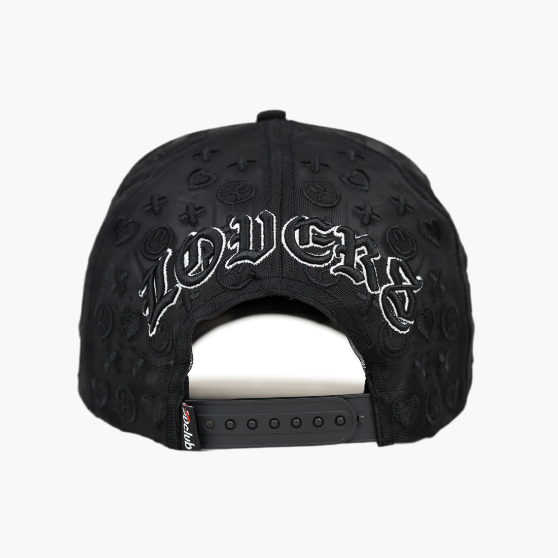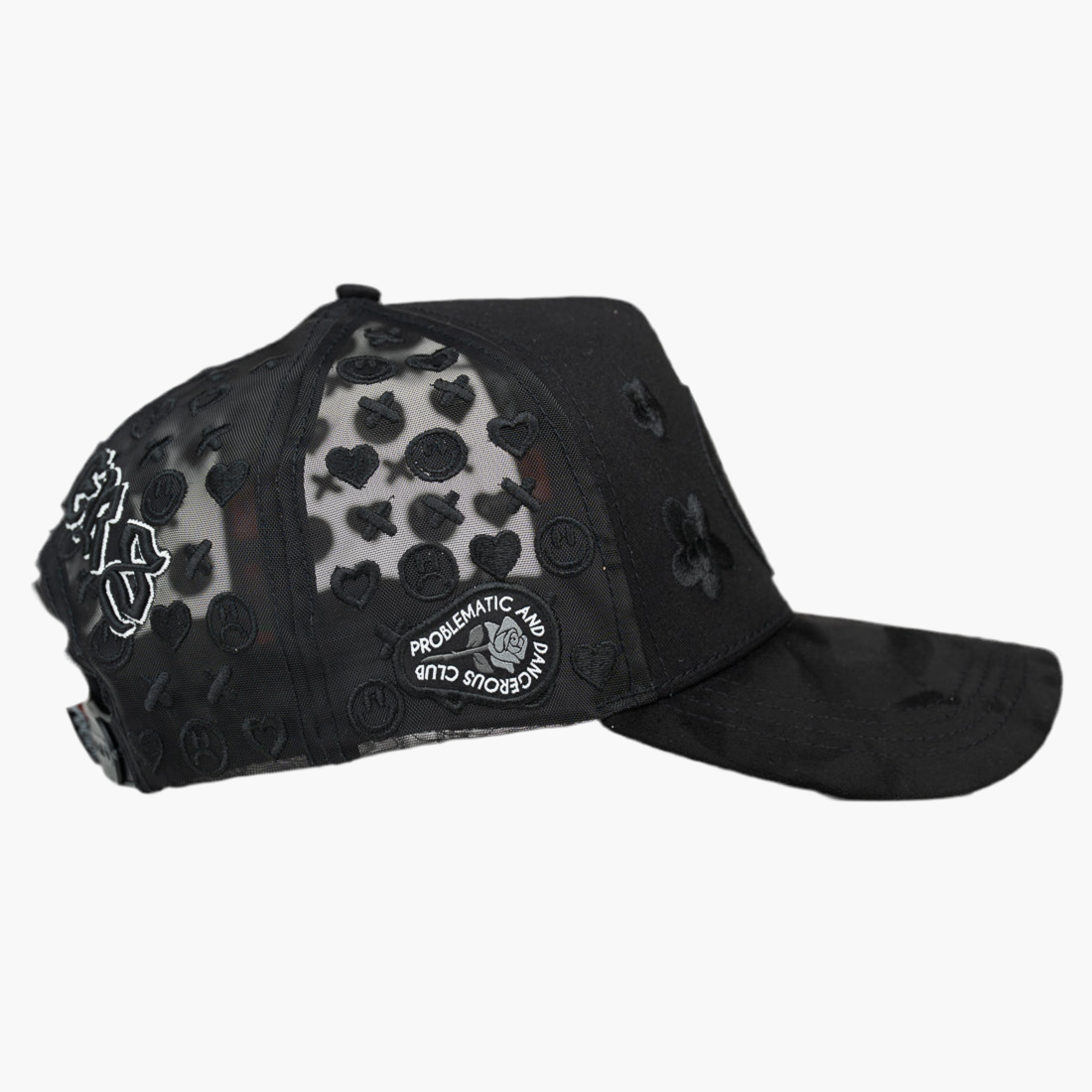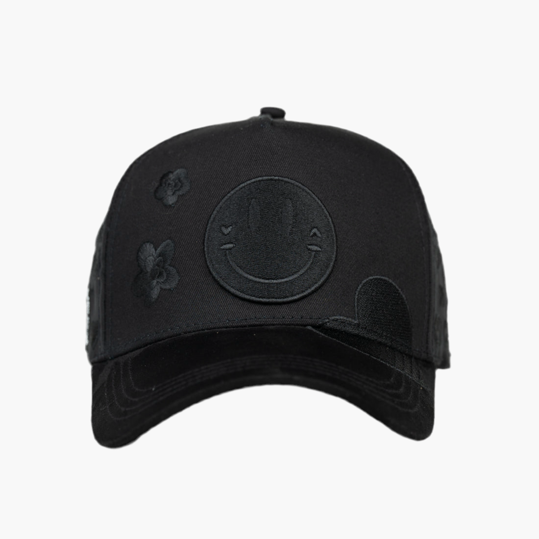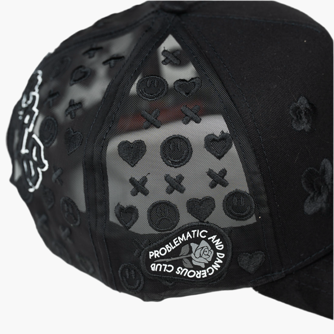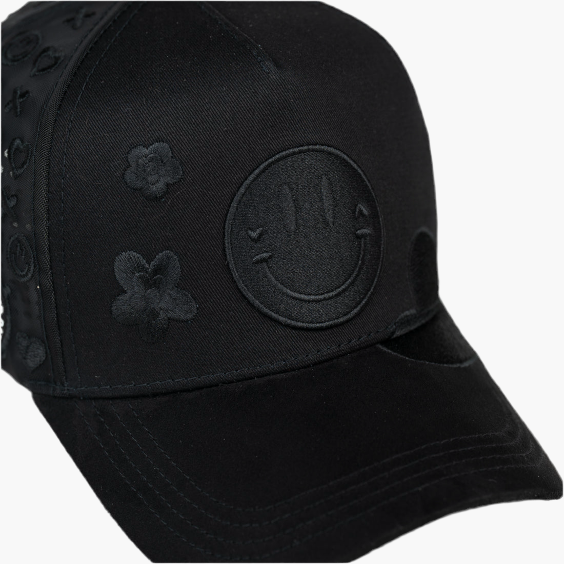 Gorra negra con diseño de malla que combina estilo y frescura. En la parte frontal luce bordada una cara feliz, mientras que en la malla se destacan parches de corazones, cruces y más caras felices, aportando un toque divertido y juvenil para completar cualquier look casual.