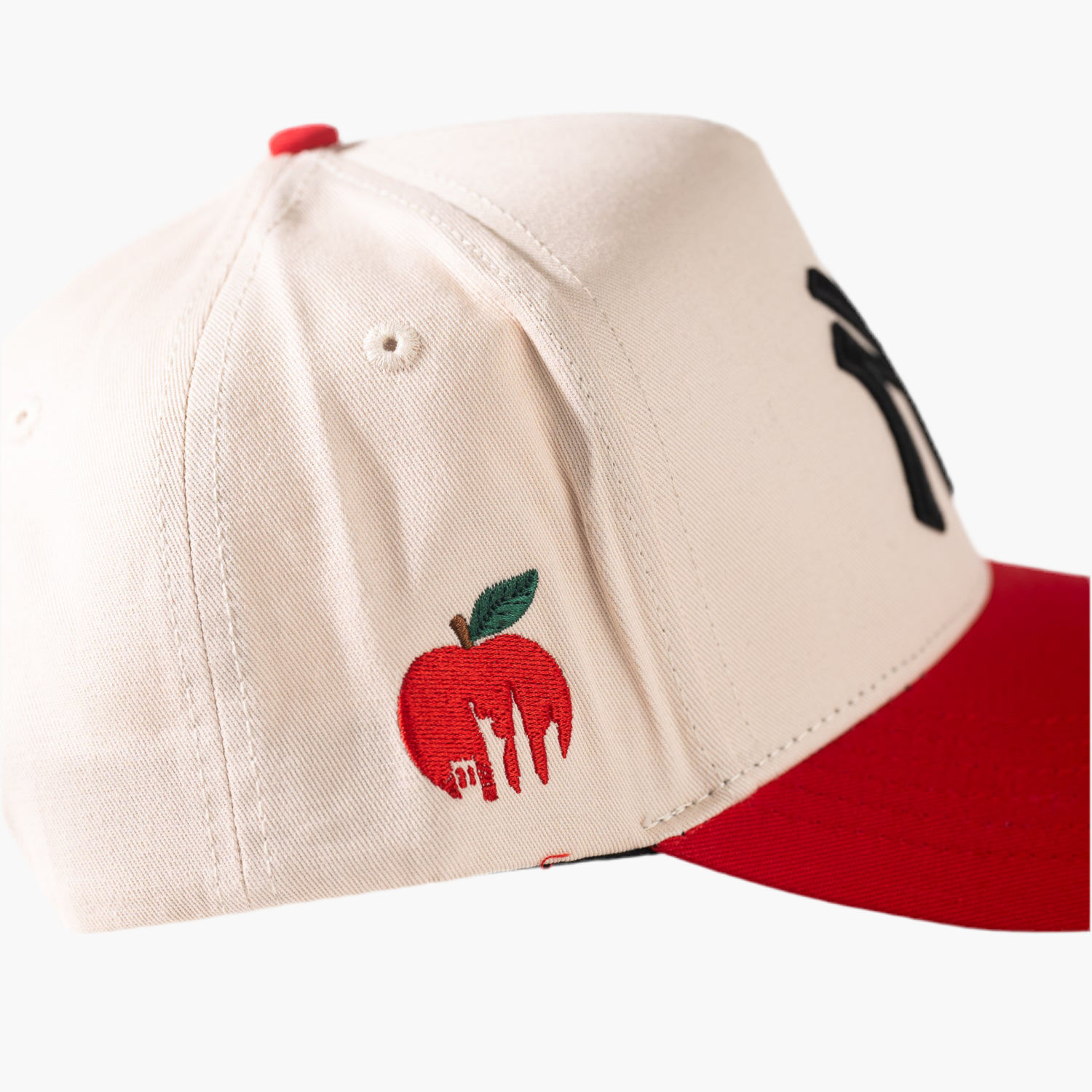 Gorra beige con el logo "NY" en negro en la parte frontal, que aporta un estilo clásico y elegante. En el lado derecho, un tomate rojo añade un detalle divertido y original, combinando sobriedad y color en un diseño versátil perfecto para cualquier ocasión casual.