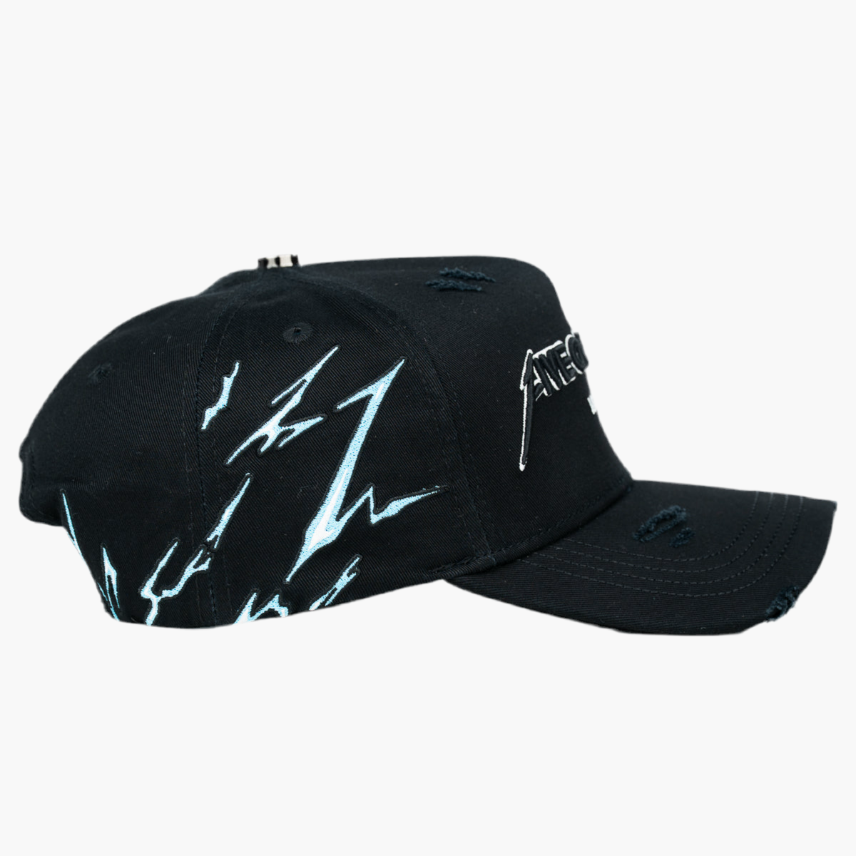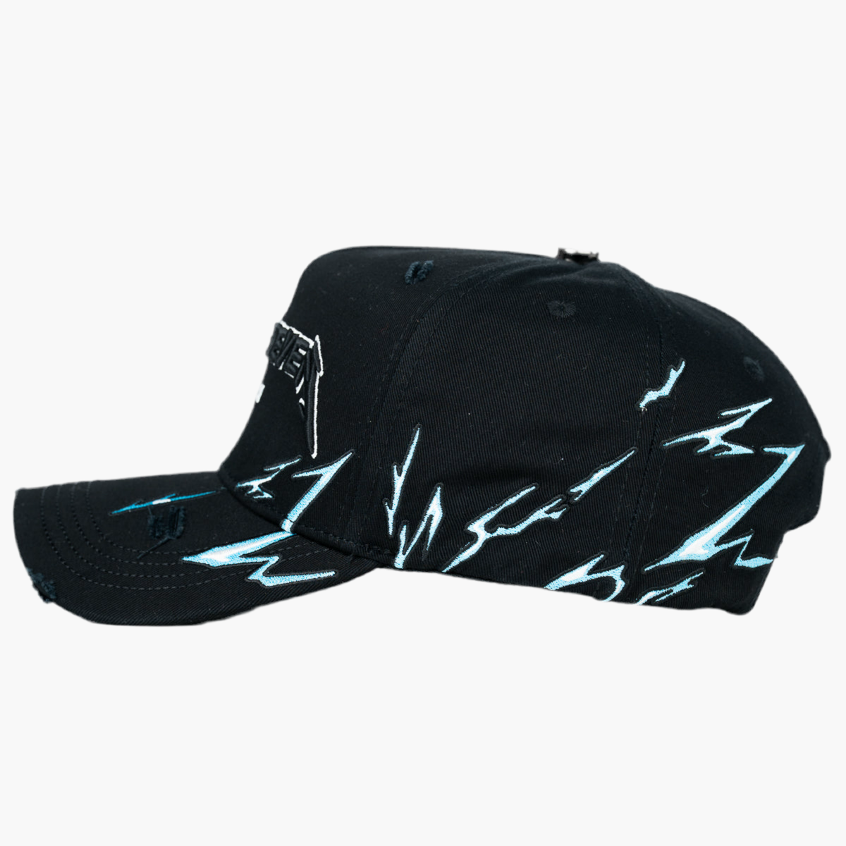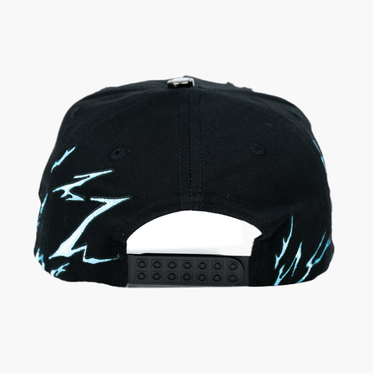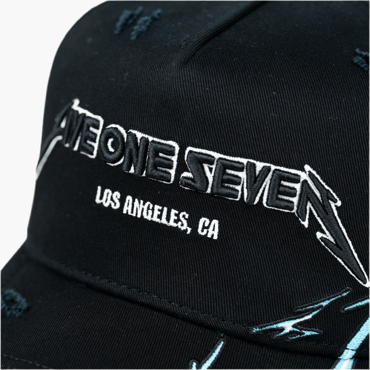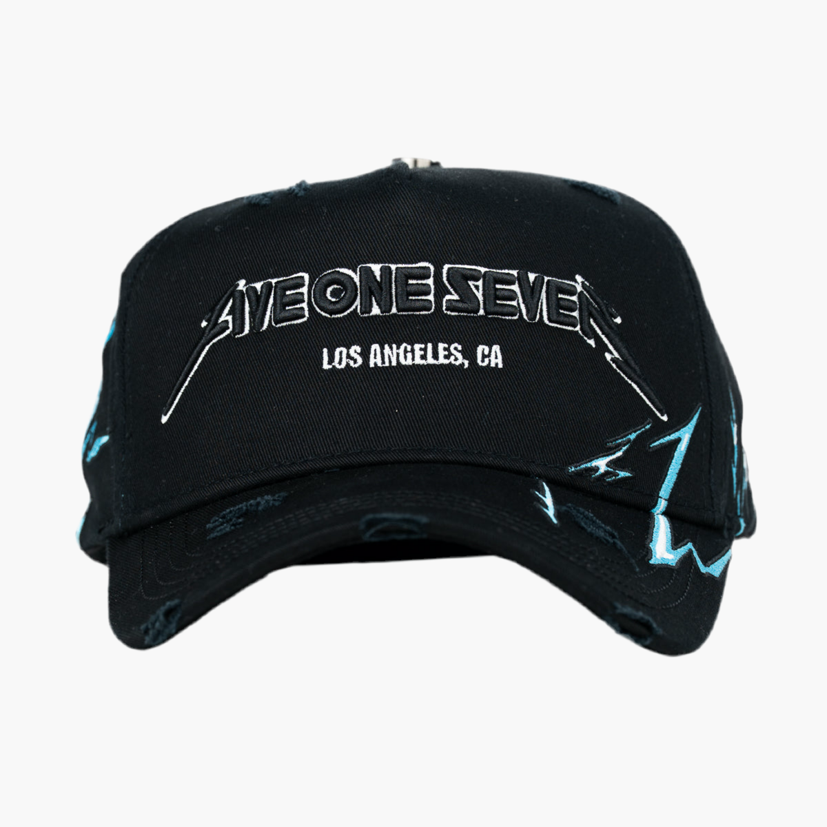 La gorra RETRO FROZEN en color negro presenta el texto “Five One Seven” con borde blanco destacado, acompañado de “Los Ángeles CA” en tamaño más pequeño abajo. A los lados, rayos azules añaden dinamismo, combinando estilo urbano y detalles vibrantes en un diseño moderno y atractivo.