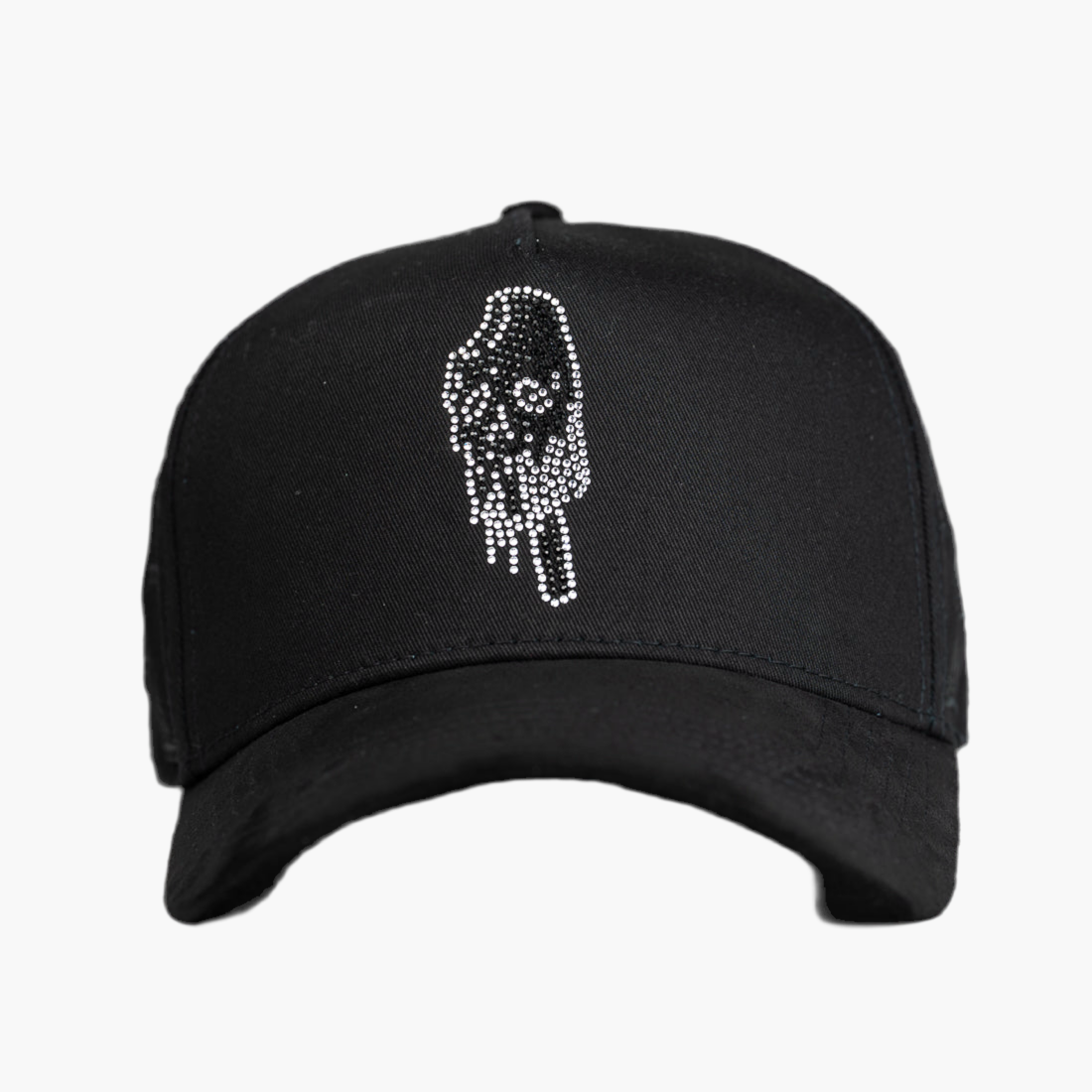 Esta gorra negra destaca por una parte frontal adornada con piedras brillantes que forman una Paleta congelada derritiéndose Su diseño único combina estilo y sofisticación, ideal para quienes buscan un accesorio llamativo y elegante que realza cualquier atuendo con un toque moderno y exclusivo.