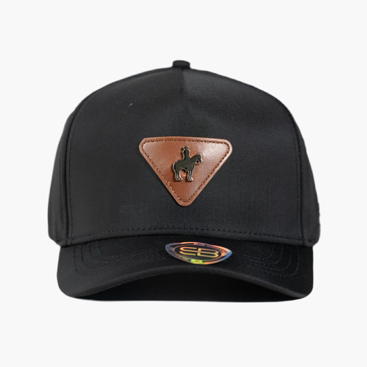 Gorra negra con una placa de cuero frontal que destaca por su diseño detallado: un caballo con una persona montándolo. Este accesorio combina elegancia y originalidad, ideal para quienes aprecian un estilo distintivo y artesanal que refleja fuerza y tradición en cada detalle.