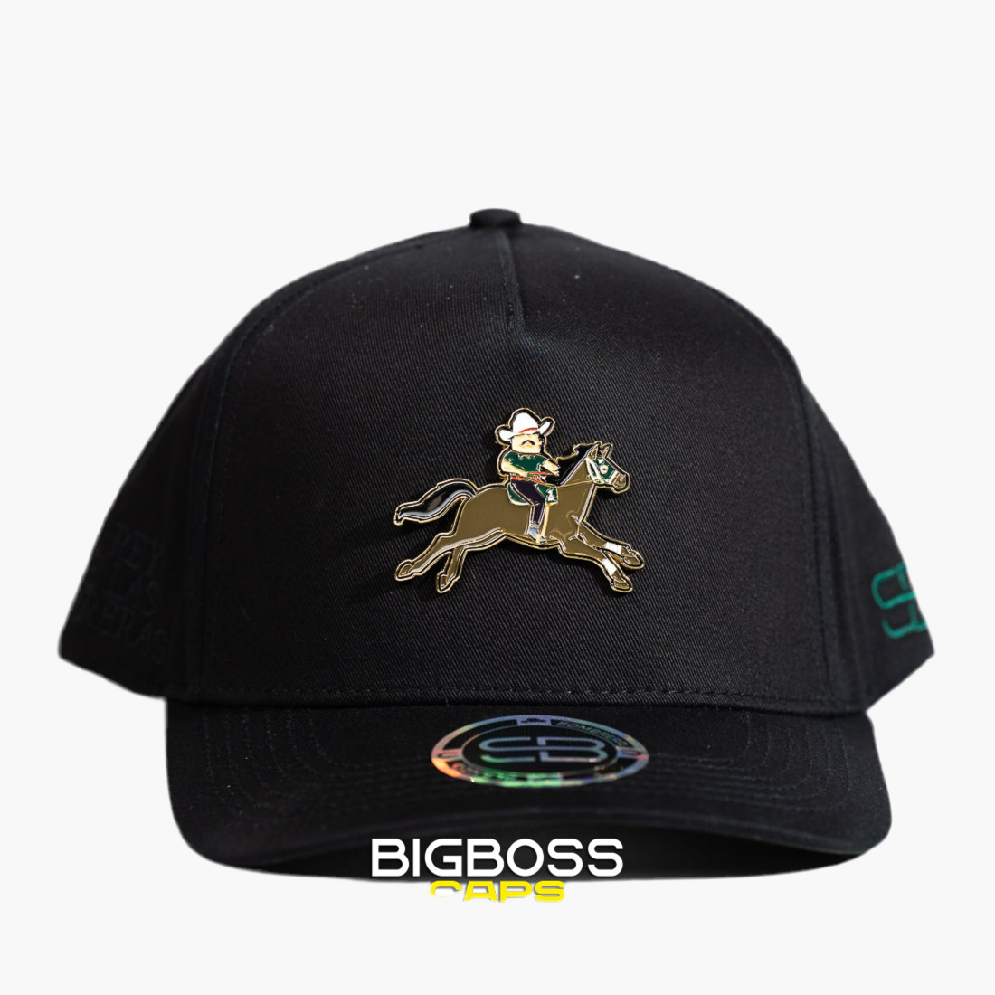 Esta gorra negra destaca por la placa central que muestra un caballo con una persona montándolo, simbolizando fuerza y dominio en las carreras. Su diseño elegante y detallado resalta la pasión por la velocidad, ideal para quienes buscan un estilo único y representativo en accesorios deportivos.