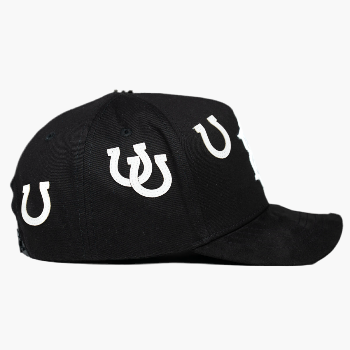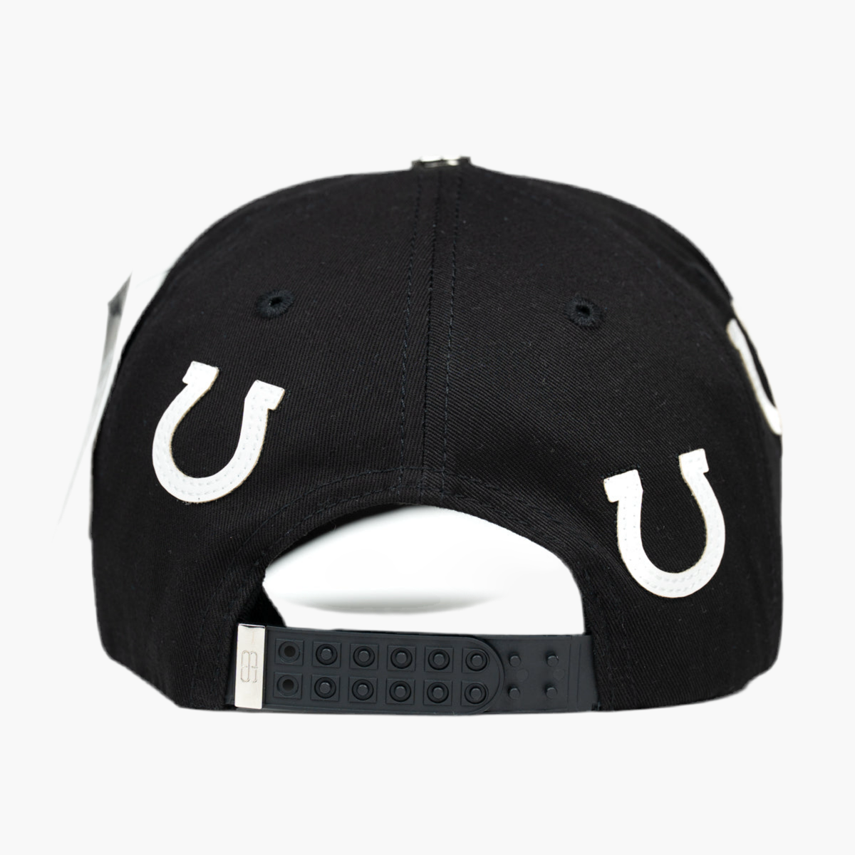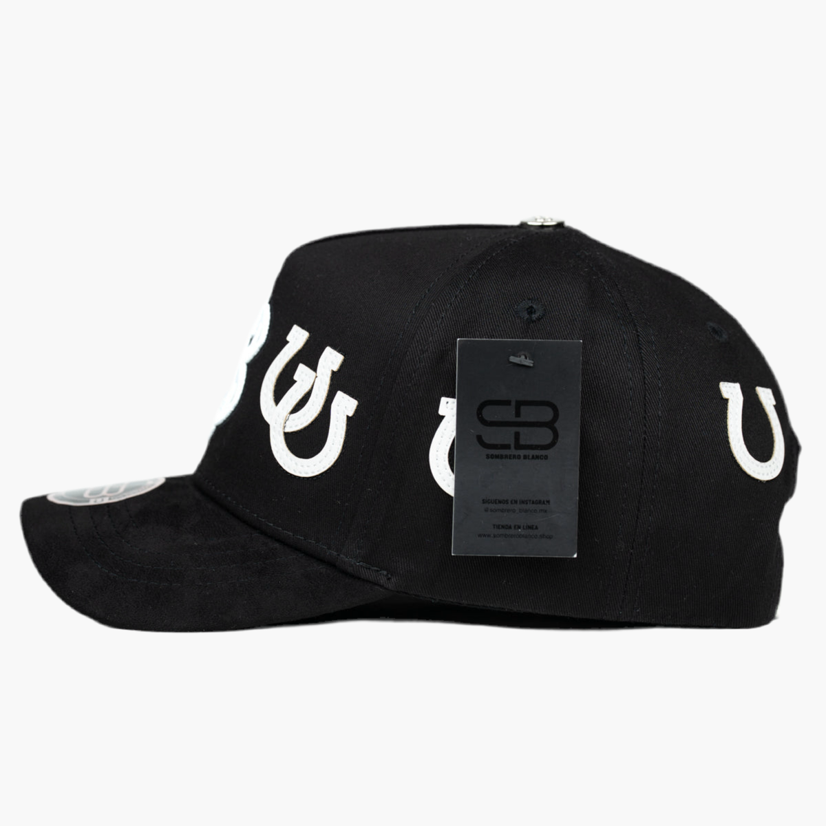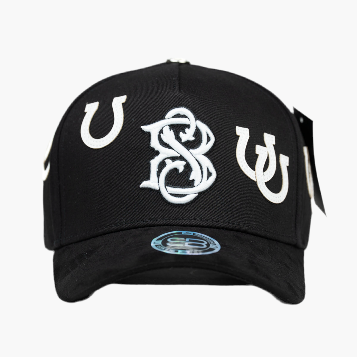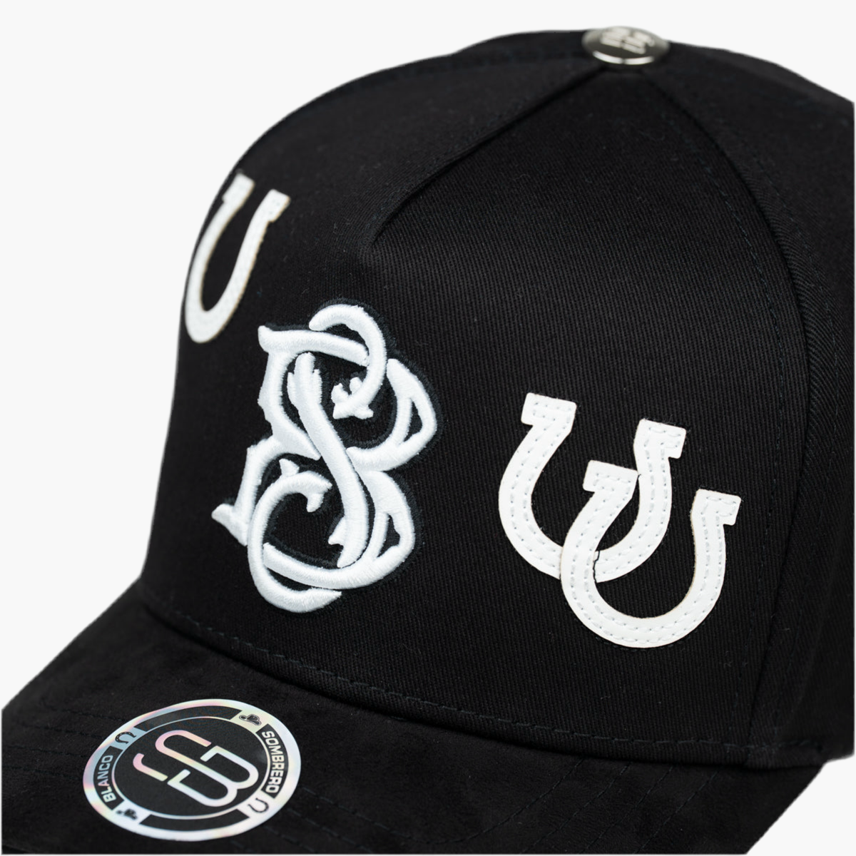 Gorra negra con bordado blanco “SB” al lado del logo. En el lado derecho lleva una herradura, mientras que en el otro lado presenta dos juntas bordadas. Diseño clásico y distintivo que combina elegancia y estilo deportivo para un look versátil y moderno.