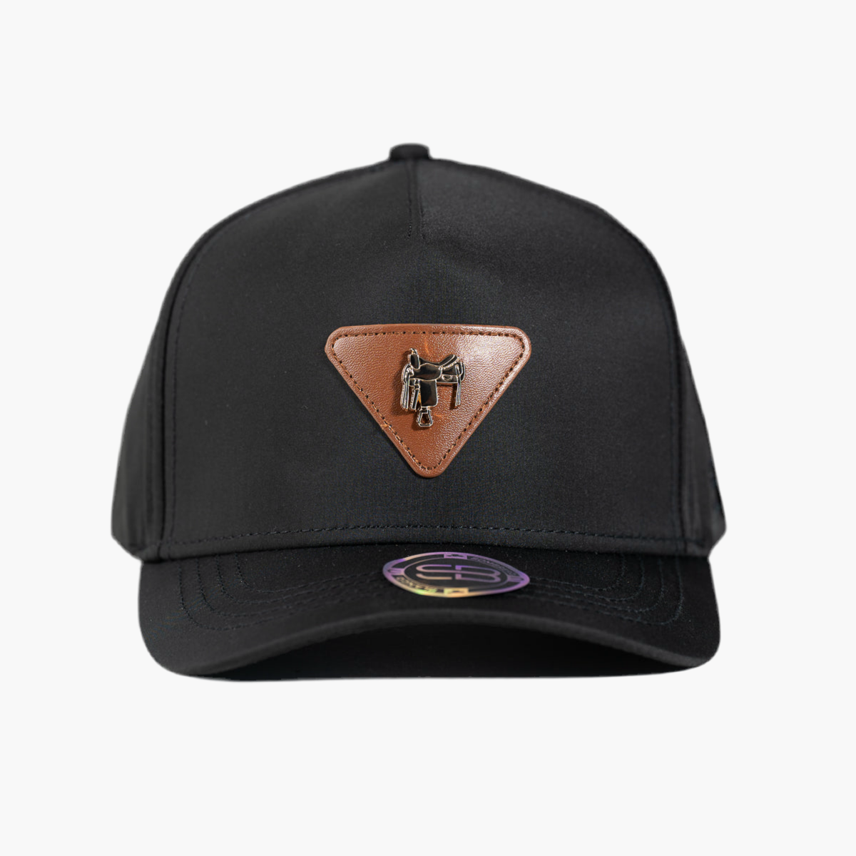 Gorra negra con una placa de cuero frontal que destaca por su diseño detallado:una silla de caballo Este accesorio combina elegancia y originalidad, ideal para quienes aprecian un estilo distintivo y artesanal que refleja fuerza y tradición en cada detalle.