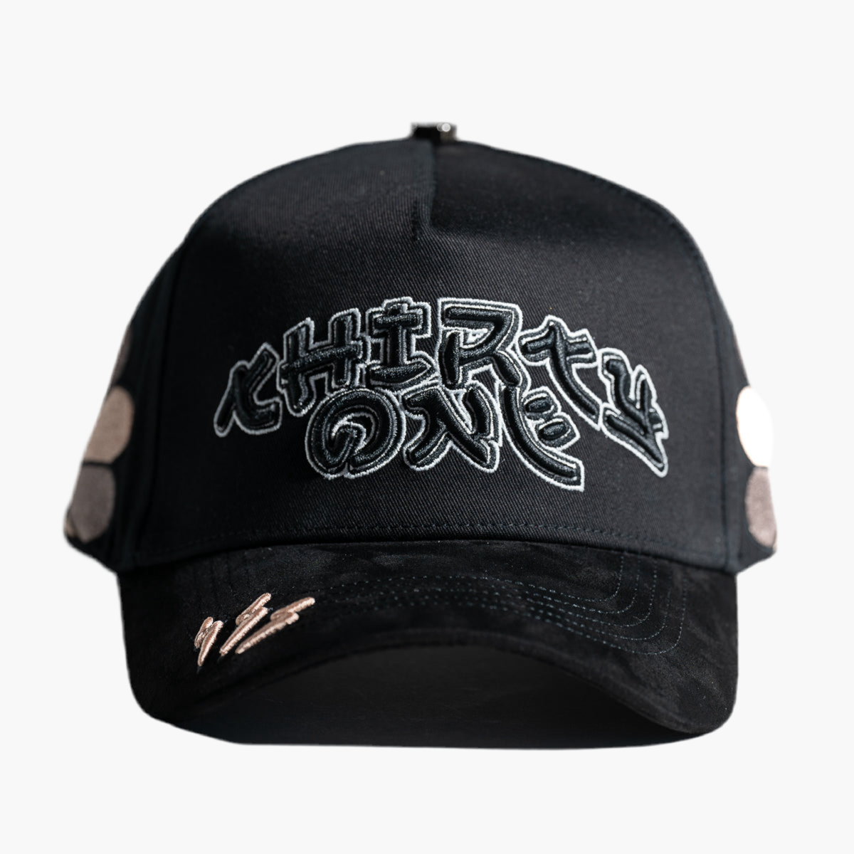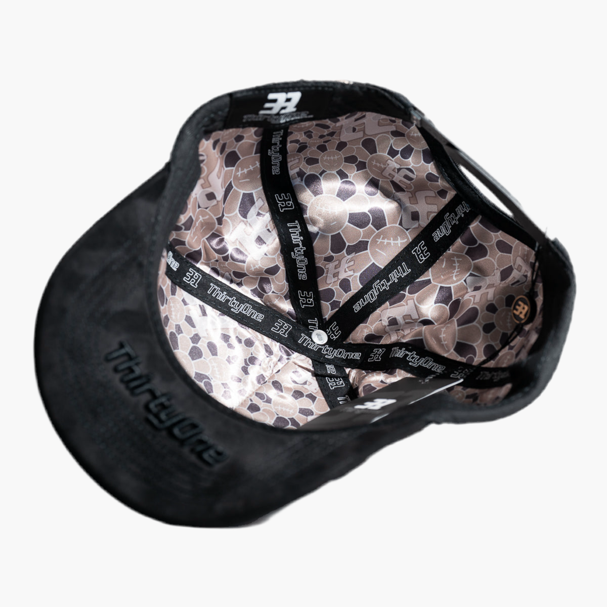 Gorra negra con el texto "thirty one" en negro, destacado por un borde blanco que resalta el diseño. En el lado derecho, una flor con una cara seria añade un toque artístico y único. Combina estilo sobrio y detalles originales para un look urbano distinguido.