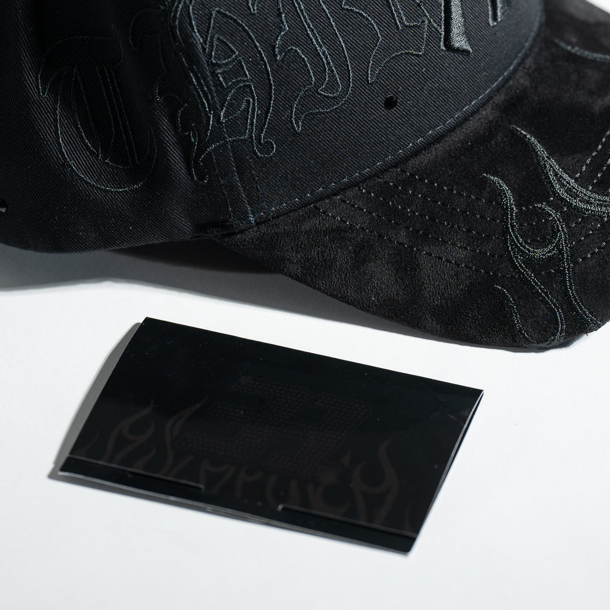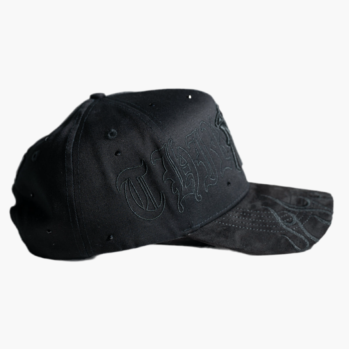 Gorra negra con el logo NY bordado en el centro, también en negro, creando un diseño sobrio y elegante. La visera luce llamas bordadas en negro que aportan un toque audaz y moderno. Esta gorra combina estilo sencillo con detalles distintivos para un look urbano y sofisticado.